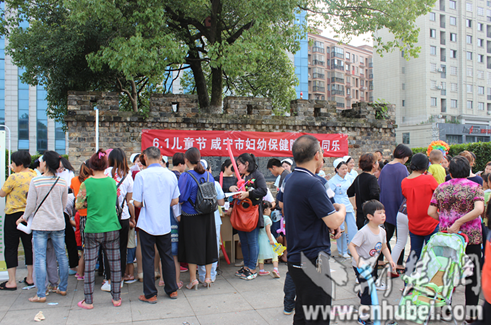 咸宁市妇幼保健院儿科医护人员在咸宁市十六潭公园广场上为孩子们义务体格检查