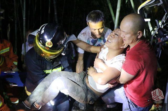事发地位于偏远山顶的小路边,道路狭窄四周杂草密林丛生,路面有部分垮塌,一旁就是深达百米的山崖。挖掘机途经时因夜晚光线不足不慎侧翻,从路边陡坡翻滚掉向崖底,好在坡上一片竹林起了缓冲作用,挖掘机卡在半山腰,但摇摇欲坠随时可能掉下去。附近村民发现后,立即赶过来查看并报警求助。四周一片漆黑,大家打开手机电筒,发现挖掘机已倒过来,司机是名年轻男子,腰部以下被卡住无法动弹,身上受伤有血迹,表情痛苦。