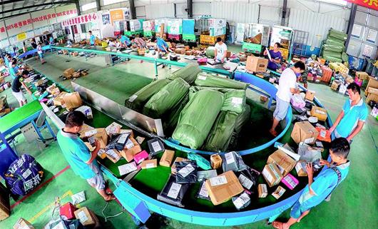 6月29日,赤壁市康华物流园快递分拨中心,员工正在传送带上按区域分拣包裹。50余家物流、仓储企业入驻该园,每天约有2.8万件包裹进出。赤壁市整合物流资源,实行统一收寄处理,快递效率提高了,派件成本降低约20%,寄件成本降低50%以上。