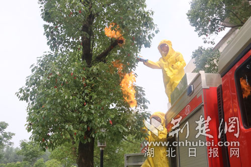 在指挥员的指挥下,一名消防战斗员负责警戒,做好安全提示和指引工作;两名消防战斗员迅速穿戴好防蜂服,戴上防护手套和头盔,利用火攻的方法将树上的蜂巢烧毁,用套袋的方式摘除电线上的蜂窝。摘除完毕后,消防官兵认真清查现场,对蜂巢进行掩埋,清剿残余马蜂,彻底消除隐患。