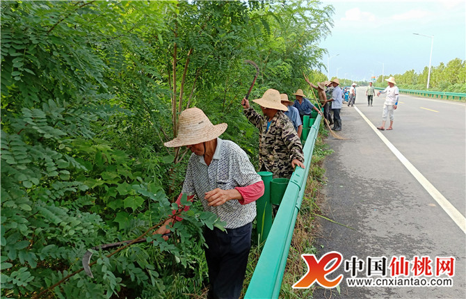 烈日炎炎、热浪阵阵,沙湖镇高速公路连接线上,一群头戴草帽、手持镰刀的村民在修理路旁延伸出的杂草。