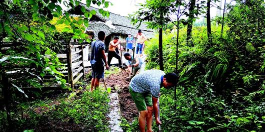 图为:7月5日,恩施州纪委驻来凤县洞塘坪村工作队成员为贫困户清理被堵渠道。(视界网 葛剑 摄)