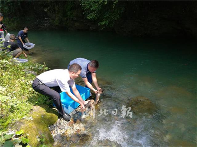 湖北日报讯(记者胡琼瑶、通讯员田育新)7月12日上午,在媒体和志愿者的见证下,30尾被救护的娃娃鱼和增殖放流的娃娃鱼苗被缓缓放入咸丰县忠建河保护区清澈的溪流中,重新回归大自然怀抱。