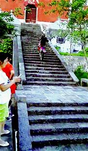 图为:有人骑摩托车在武圣宫爬台阶(读者供图)