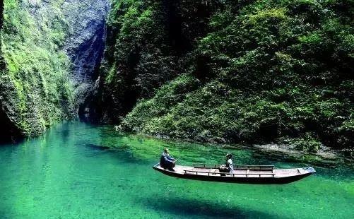 都说屏山很美,小舟在清澈无比的水中滑动,犹如悬浮在空中一般。