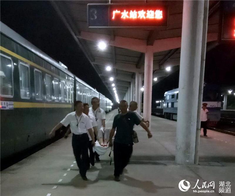 20时56分,Z49次列车在广水站6道停稳,客运值班员熊和平与列车长办理交接后,站车人员小心翼翼地将孕妇扶上担架,张扬迅速组织副站长刘振宝等6人抬起担架,快速通过连接三站台和一站台的地道,将孕妇抬上刚刚驶入一站台停稳的120急救车上,与孕妇同行的两位大人、两位儿童及携带的行李也被及时送上急救车。 21时10分,救护车一路呼啸,将孕妇送往广水市第二人民医院。 21:16分,Z49次列车从上行6道开车,经南头道岔区,驶入下行正线,赶往下一站武昌。