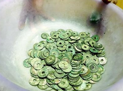 村民丁师傅挖到了数百枚古币,他用脸盆装着向记者展示。记者看到,这些古币型制不一,有的直径约3厘米,上面刻着瘦金体的“崇宁通宝”;有的直径约2厘米或1.5厘米,刻着“绍圣元宝”“天圣元宝”等字样。