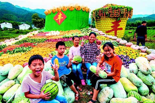 图为:9月23日,崇阳县金塘镇柃蜜小镇庆丰收,小朋友在瓜果蔬菜前留影。(湖北日报全媒记者 陈勇 通讯员 汪佳 摄)