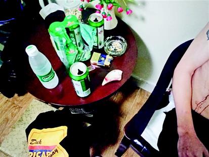 民警检查房间发现,屋内有4罐啤酒,洗漱台被敲破,阿伟手中握着的锐器就是洗漱台碎瓷片。