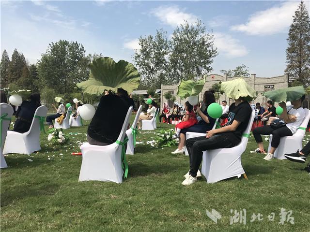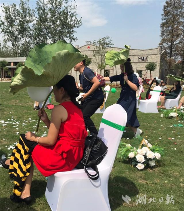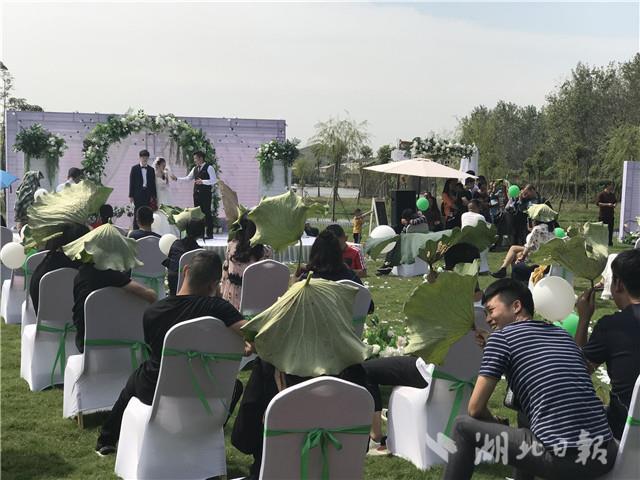10月3日中午,在仙桃市许坝村沔庄生态农业园内,参加婚礼的来宾举着荷叶,遮挡刺目的阳光。