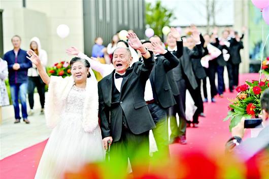 楚天都市报讯(通讯员缪北辰 记者周鹏 实习生李亚辉)昨日上午,12对老年夫妻在中建三局咸宁项目工地身着婚礼服,一起牵着手走红地毯,补办集体婚礼,幸福地弥补了当初结婚时的遗憾,追忆了一番青春岁月。