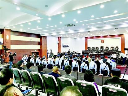 前日上午,庭审开始,23名涉黑团伙成员集体站在被告席上,出于部分被告身体不适,审判长让被告人坐下听庭。