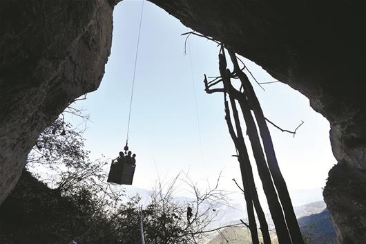 图为:吊车的吊篮从岩顶下降100多米,载着工人到达绝壁上的溶洞洞口