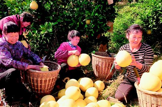 11月3日,宣恩县李家河镇园艺场柚农正在采收贡水白柚。金秋时节,宣恩县贡水白柚喜获丰收,柚农们忙着采摘、销售。贡水白柚是国家地理标志保护产品,在当地种植面积达14.3万亩,是当地农民增收和脱贫的主导产业。