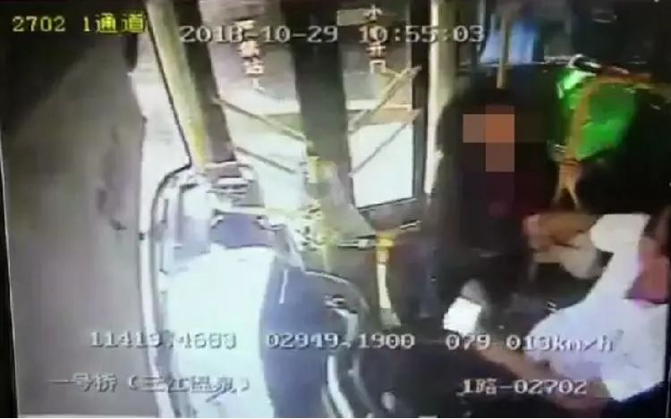 监控视频截屏: 10月29日10点55分03秒,女乘客拉拽公交司机的情景,当时车速为13公里/小时。