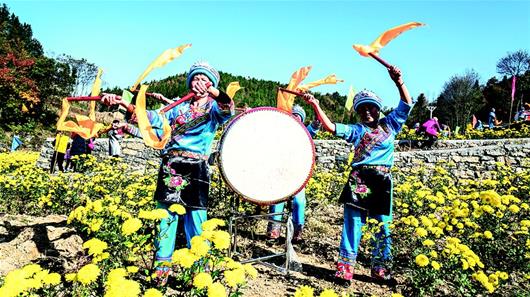 10月31日,建始县茅田乡农民在该乡梦花岭村皇菊产业园表演苗鼓。当天,以“土苗鼓韵·鼓舞茅田”为主题的2018中国建始首届土苗鼓文化艺术节在茅田乡梦花岭村举行,传承民族优秀民间文化艺术,发展乡村旅游,推动乡村振兴。 (视界网 文林 摄)