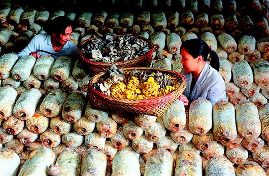 10月25日,宣恩县珠山镇猫儿堡村一家蘑菇合作社的社员正在采摘蘑菇。宣恩县采取“合作社+基地+农户”的发展模式,发展玉皇菇、平菇、羊肚菌等食用菌种植,已建成集“种、销、育”为一体的蘑菇产销产业链,成为助力农民脱贫致富的有效途径。