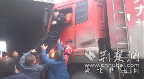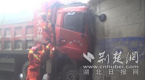 荆楚网消息(通讯员杨会、刘芳琳、肖宇)12月2日,仙桃市叶王路一辆大货车准备过涵洞时,不慎打滑撞上了涵洞中间的隔离墙,致副驾驶一人被困,幸亏仙桃消防及时救出。