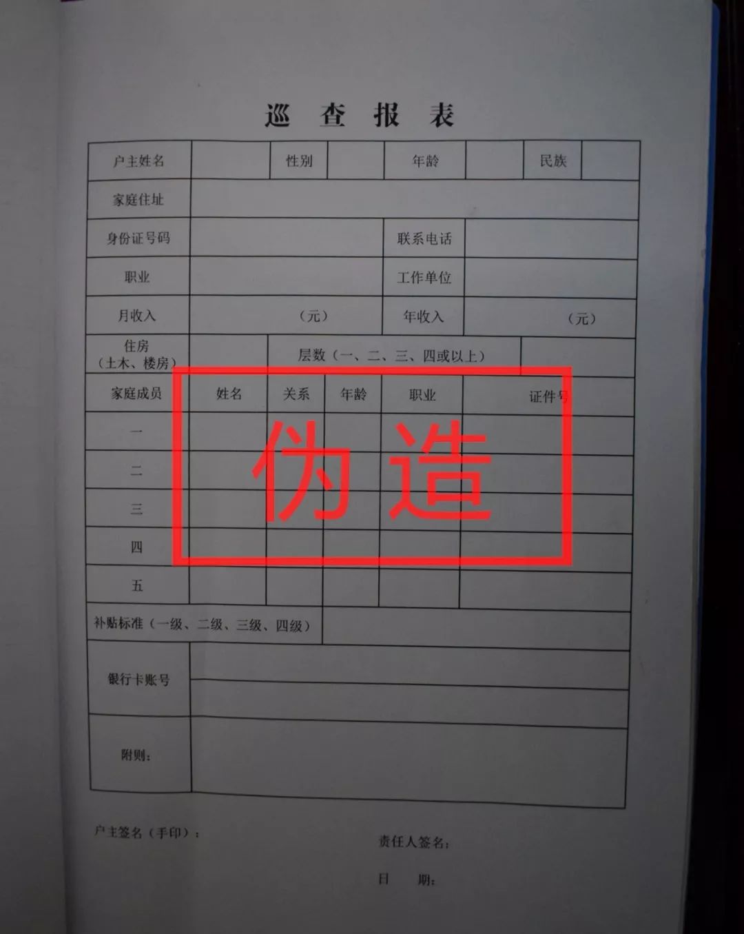 2名“扶贫干部”有模有样的在老周家里和老周拉起了家常,之后拿出一张巡查报表让老周填写(同样是在打印店里弄的)