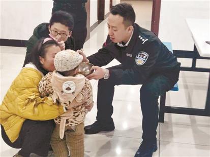 图为:民警细心照料男童