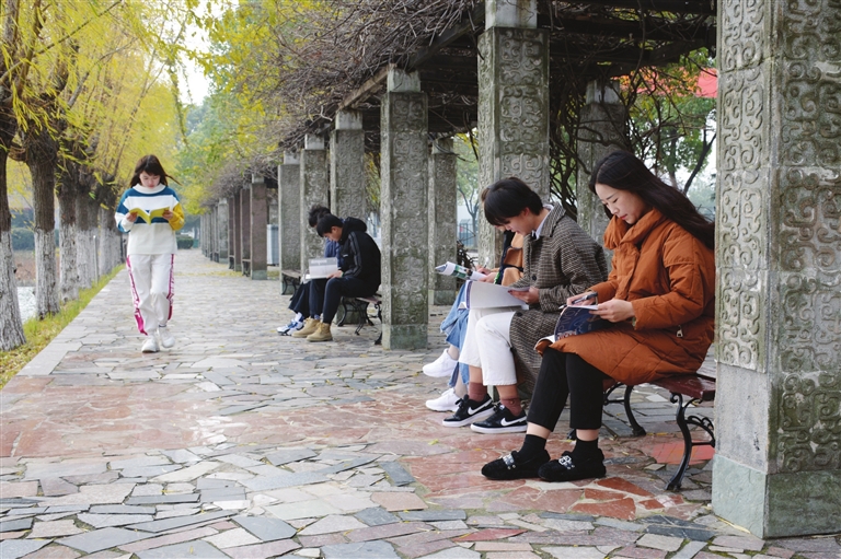 临近期末,考试将至。仙桃职院校园内处处是学生埋首复习、认真备考的身影。图为镜湖旁,学生们结伴复习功课。