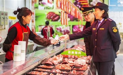 12月27日,武邑县食品和市场监督管理局执法人员在一家超市检查肉类销售人员的健康证。