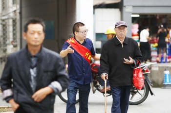 荆门晚报党员志愿者在街头开展文明劝导活动。