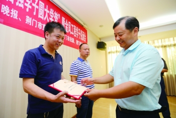 荆门晚报开展助学活动,荆门晚报总编辑丁川为爱心人士颁发证书。