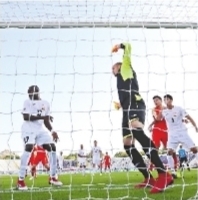 吉尔吉斯斯坦队守门员马佳什(右三)在比赛中扑救失误 新华社发