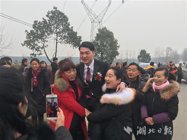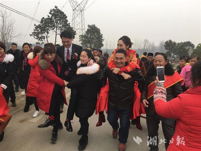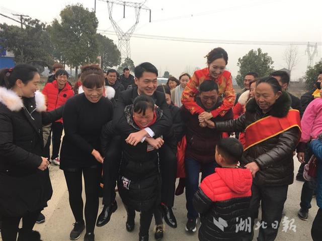 元月28日,湖北日报讯全媒记者在孙桥陈集村采访,目睹这一独特婚俗。25岁的新娘王雅是陈集人,迎娶的新郎从钟祥远嫁而来。11时许,迎亲车队停在离新娘家一公里路边,王雅的父母王峰、张宏与亲友早早等候,新郎邓任超一开车门,脚不离地,坐上丈母娘及其姐妹用手搭建的“软轿”。伴随阵阵锣鼓,鞭炮齐鸣,“软轿”朝前奔去。