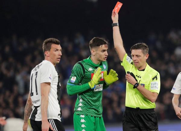 第25分钟,马尔库特回传门将力量偏小,C罗前场抢断,门将梅雷扑上抢,C罗顺势倒地。裁判红牌将梅雷罚下,这导致上半时一半时间那不勒斯都只能10人应战。