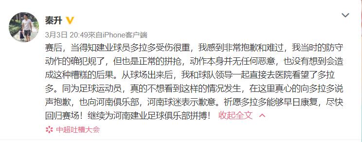 在与多拉多身体对抗导致其受伤的一方队长秦升第一时间也赶往医院探望情况,除了当面道歉之外,他还通过自己的个人微博表达了歉意。