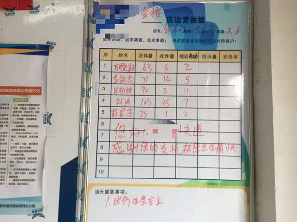 “收件就是靠能力了,他的收件比我们多多了。”同事牟来旺指着3月6日的网点运营数据说,刘涛的当日收件量达到了45件,远远超过其他同事,牟来旺说,刘涛人缘好、态度好,每天收的货特别多,在快递点每天收件量都是第一名。