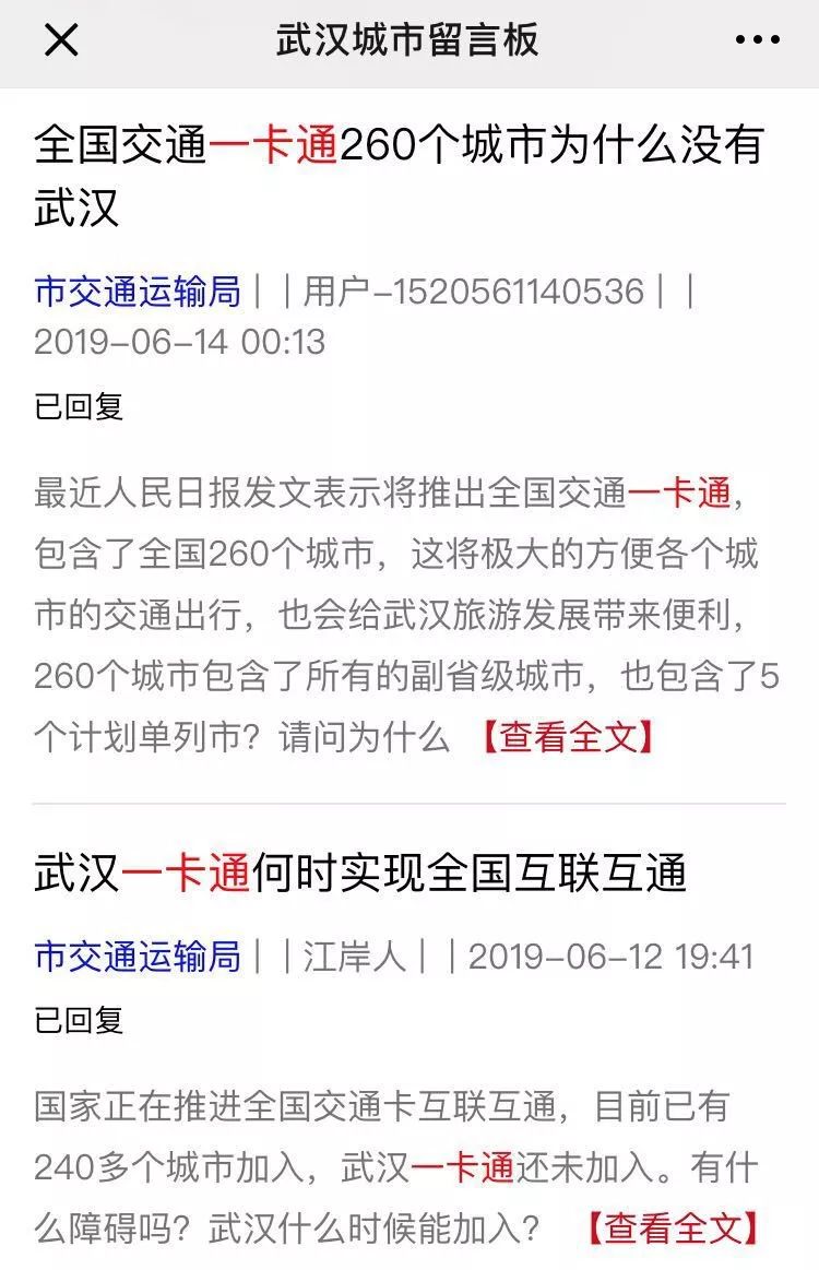 今年3月至6月,武汉城市留言板上呼吁武汉交通卡互联互通的留言持续不断。