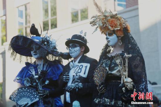 资料图:当地时间2018年10月28日,美国休斯敦糖城(Sugar Land)在市政厅广场举行万圣节盛装比赛。 中新社记者 曾静宁 摄