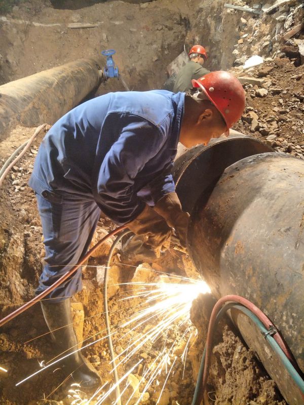 自来水由水厂经管道输送到用户过程中,由于用户多,楼层高,水压压降后,使得有些地方上不去水,必须在途中某些地方增加泵站加压。城北加压站位于泉口一路市供水总公司院内,原来生产能力为1万吨/天,近年来,随着城北用户的增多,原有的加压站难以满足该区域用水需求,市供水总公司将城北加压站进行了升级,将供水能力提高至3万吨/天。为做好新加压站的抢口接入工作,市供水总公司决定13日23时至14日10时,停用加压站,将改造的加油站进出水管与城区区域主管抢口连接。13日23时,供水人员停用城北加压站后,关闭加压站进出阀门,排空管道水,切开原有管道并与新加压设备进出水管道焊接(如图)。