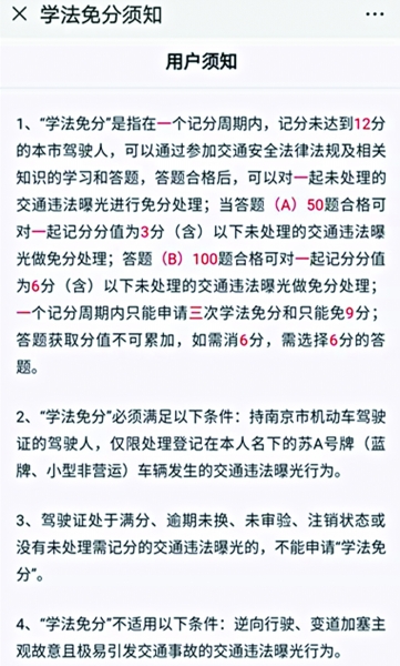 相比于成都,南京的实践更早一些。2017年5月20日,南京交警便正式推出了“学法免分”业务。按照规定,“学法免分” 是指在一个记分周期内,记分未达到12分的南京本市驾驶人,参加交通安全法律法规及相关知识的学习和考试。如果考试合格,则可对未处理的交通违法曝光,做免记分处理。一个记分周期内能申请3次学法免分。目前,南京驾驶员在一个记分周期内最高可减免9分。