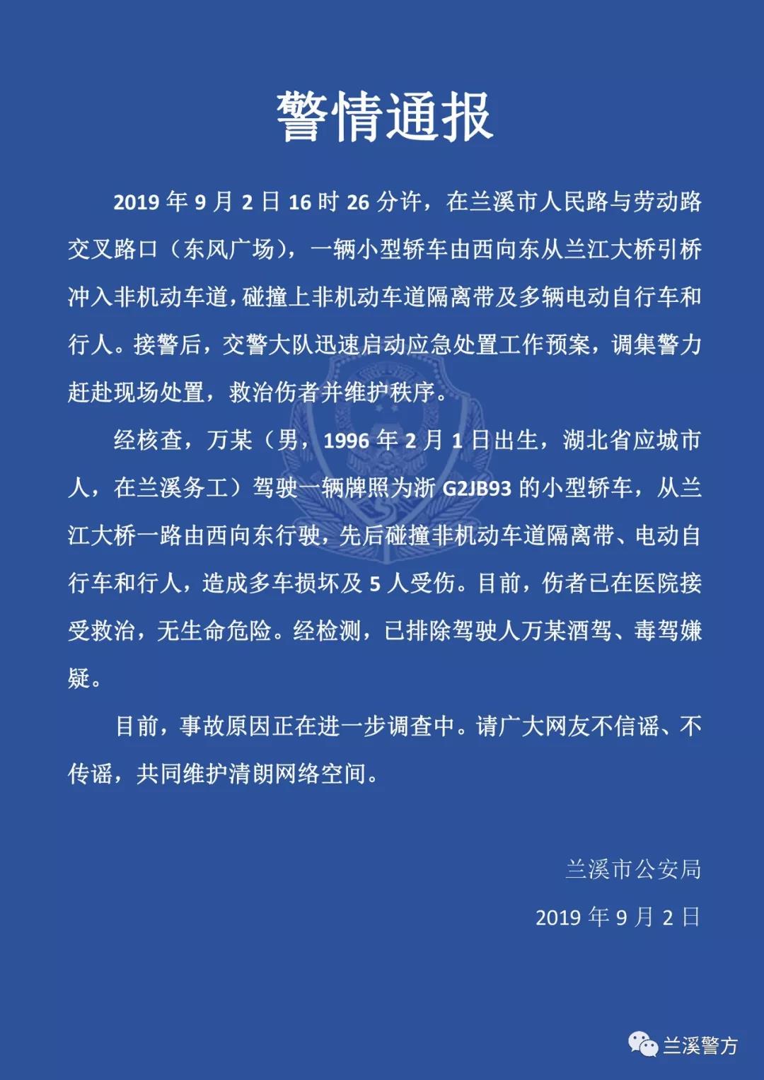 经核查,万某(男,1996年2月1日出生,湖北省应城市人,在兰溪务工)驾驶一辆牌照为浙G2JB93的小型轿车,从兰江大桥一路由西向东行驶,先后碰撞非机动车道隔离带、电动自行车和行人,造成多车损坏及5人受伤。目前,伤者已在医院接受救治,无生命危险。经检测,已排除驾驶人万某酒驾、毒驾嫌疑。