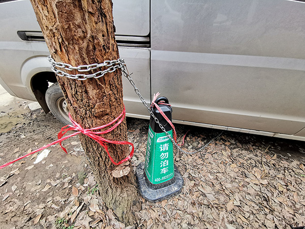 武汉一小区业主用铁链缠树独占车位。视觉中国 资料