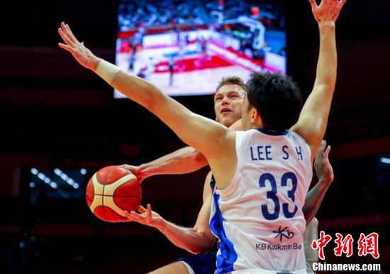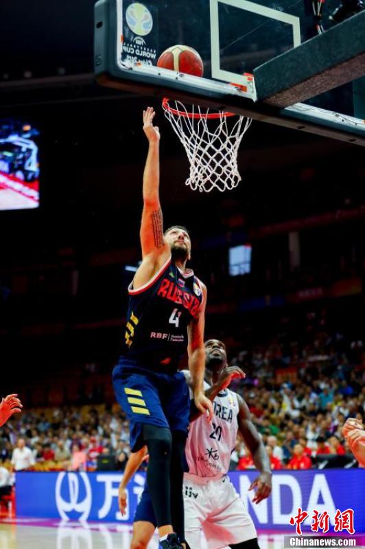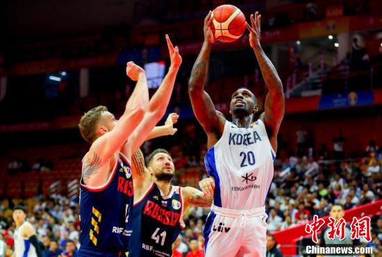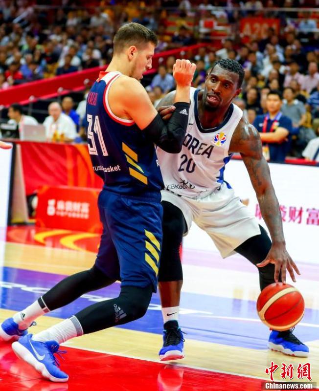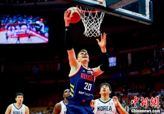 9月2日晚,俄罗斯球员祖布科夫(蓝衣)篮下分球。当日,在湖北武汉举行的2019年国际篮联篮球世界杯小组赛B组比赛中,俄罗斯队以87比73击败韩国队。 中新社记者 张畅 摄