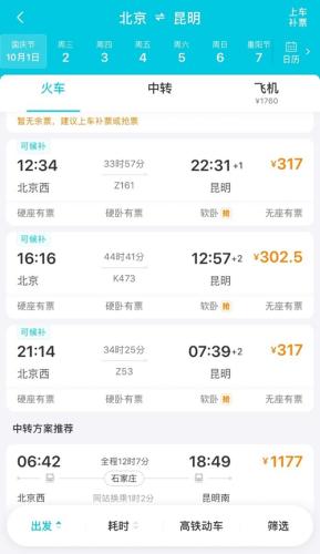 同时,抢不到火车票也可以提前购买飞机票。去哪儿网平台显示,还有折扣较低的机票。10月1号北京到南京还有少量4.3折机票,北京飞乌鲁木齐3.2折,北京飞青岛4.9折,均在5折以内。