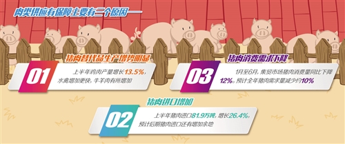 该负责人解释,之所以说供应有保障,主要有三大因素:一是猪肉替代品生产增势明显。据监测,上半年鸡肉产量增长13.5%,水禽增加更快,牛羊肉生产周期长,但也有所增加;二是猪肉进口增加。上半年猪肉进口81.9万吨,增长26.4%,预计后期猪肉进口还有增加余地;三是猪肉消费需求下降。非洲猪瘟疫情发生以来,猪肉消费也受到了抑制。据监测,1月至6月,集贸市场猪肉消费量同比下降12%。虽然下半年进入消费旺季,但猪肉价格上涨也会对消费产生进一步抑制,预计全年猪肉需求量减少约10%。