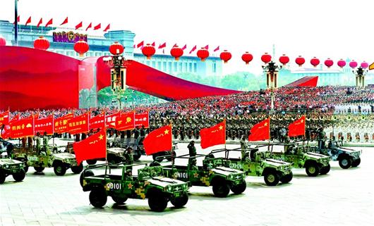 行进在装备方队的最前列,载着100面荣誉战旗的猛士车缓缓驶过天安门,全军荣誉功勋部队代表组成的战旗方队浩荡而来。