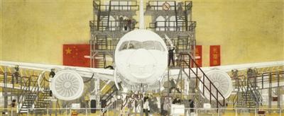 范春晓中国画《中国制造走向世界——C919大飞机》。