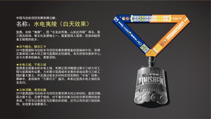 全程、半程马拉松奖牌名为“水电夷陵”,借用宜昌古称“夷陵”,采用战国编钟外形。奖牌正面为三峡大坝工程和天然塔和奥体中心等宜昌标志性建筑浮雕,将古今元素有机融合,力求展示宜昌城市发展的卓越成果与三峡工程的重大意义。