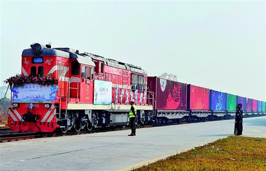 图为:全国首个以世界军运会吉祥物命名的中欧班列火车“兵兵号”,从武汉临空港经开区吴家山铁路集装箱中心站启程,途经俄罗斯、白俄罗斯、波兰等“一带一路”沿线国家,开往终点站德国汉堡港。(湖北日报全媒记者倪娜通讯员宋亮摄)