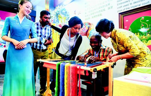 图为:在北京外交部湖北全球推介活动现场,汉绣传人王子怡(右一)教外宾刺绣。(湖北日报全媒记者梅涛摄)