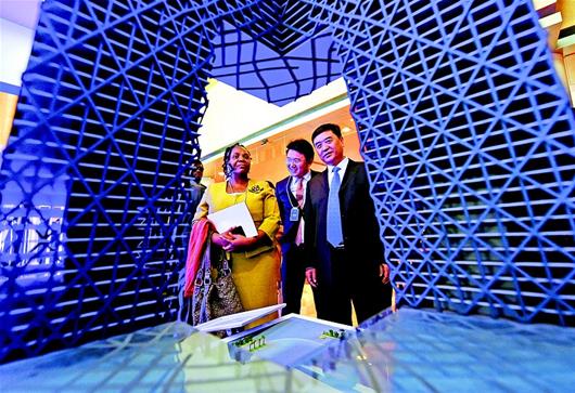 图为:在武汉举行的中国中部国际产能大会“一带一路·建筑未来”建筑工程专场上,外宾在东湖国际会议中心参观企业集市。(湖北日报全媒记者倪娜摄)