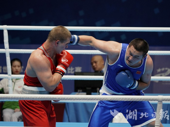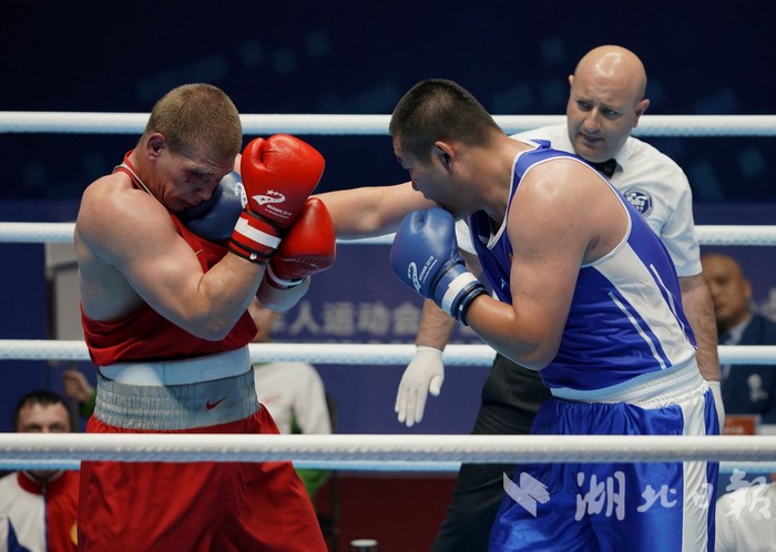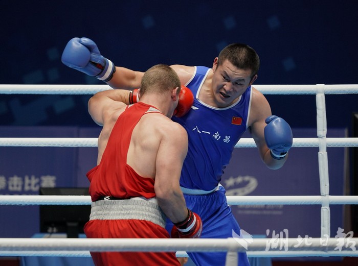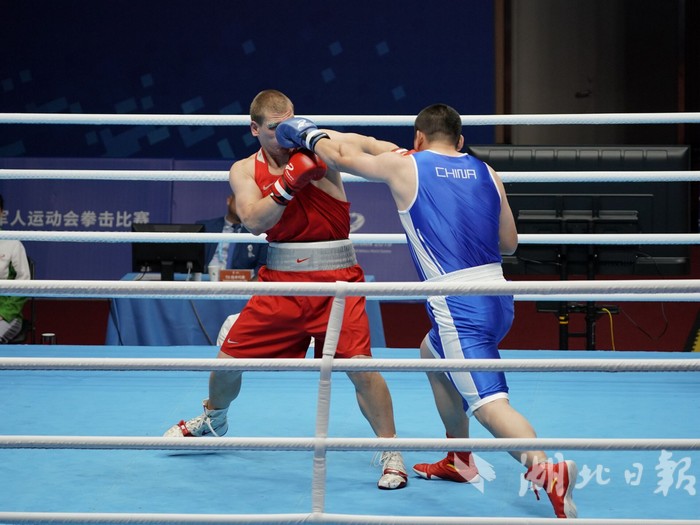 26日,男子拳击91+公斤级决赛,中国选手牟海鹏(蓝方)获得银牌。(湖北日报全媒记者 刘建维 摄)