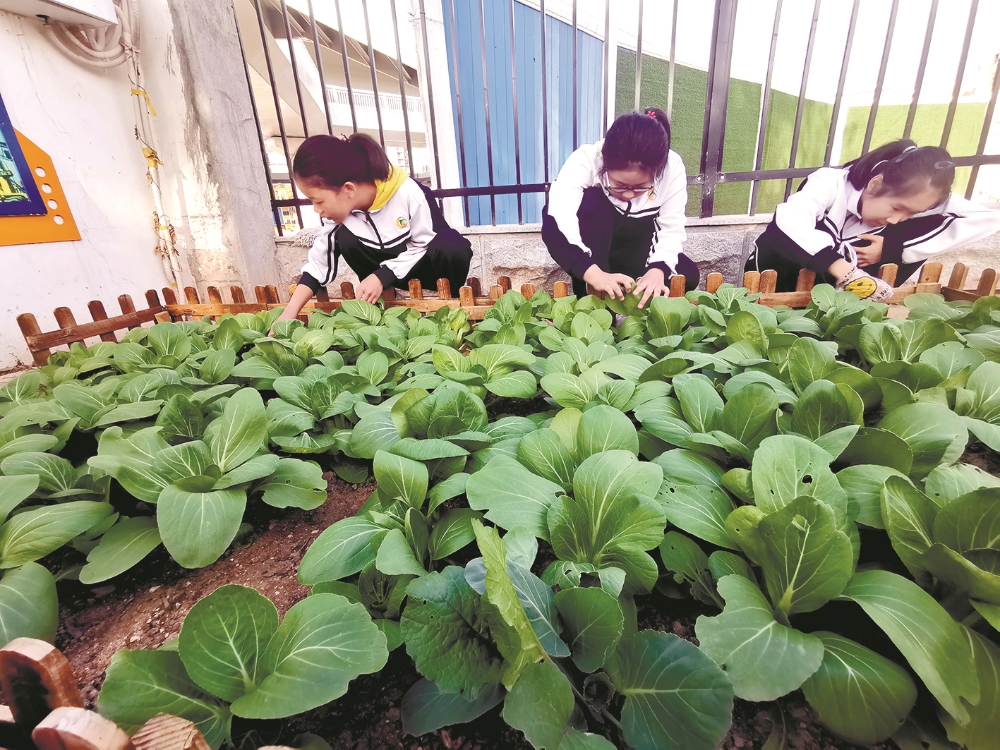农场管理老师之一的李冬介绍,这里原本是一块荒地,今秋开学后,学校请来省农科院的专家指导,将其打造成现在的模样。从土建、耕地、施肥、播种,到日常养护,学生们全程参与。“菜园名字是学生起的,种的作物也由他们投票决定,学校还举行了授牌仪式。”李冬说,每个班还开班会竞选出了“责任田”的5人的看护小组。
